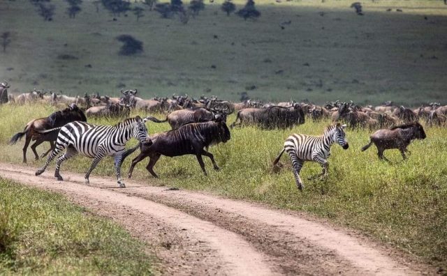 Thousands of Wildebeest at Serengeti National Park during the migration of animals. At this time we experience ecosystem on the site when the Lions and leopards catching the Wildebeest and Zebra for their food. Share on social networks